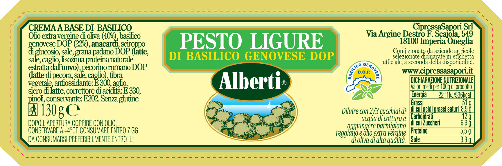 This delicious recipe, whose origins in Ligurian cuisine date back to the 1800s, is an Italian gastronomic patrimony. Originally used to flavor the minestrone, only in the early twentieth century it becomes a condiment for pasta. Ideal to accompany all types of hard or fresh pasta. It goes perfectly with the typical trofie or the Ligurian trenette and leaves free interpretation to a creative kitchen. Dilute with 2/3 tablespoons of cooking water, add Parmigiano Reggiano and Alberti extra virgin olive oil. Season then cold.