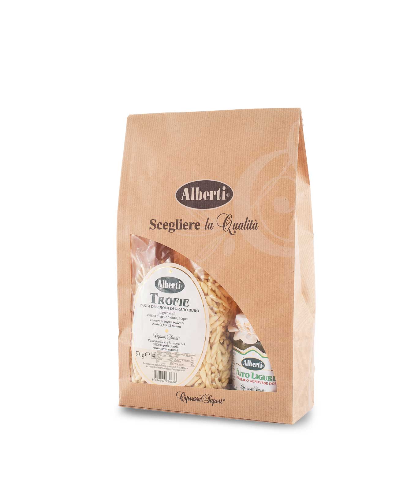 Practical pack containing typical Ligurian Trofie and our excellent Genovese DOP basil Pesto in elegant octagonal jar.