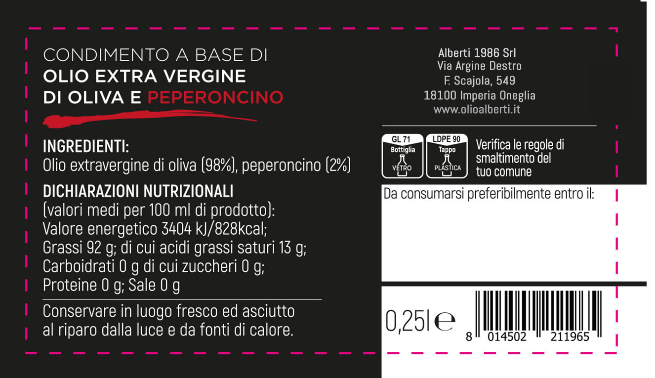 Un tocco in più ai tuoi piatti! Alla purezza del nostro olio extravergine abbiamo unito un selezionato aroma naturale di Peperoncino. Un ottimo condimento da tavola che dona al cibo vivacità e gusto.