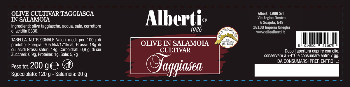 Dopo la raccolta, le olive di qualità Taggiasca sono conservate circa un anno in una salamoia composta da acqua, sale, erbe aromatiche e aromi naturali ed invasate.