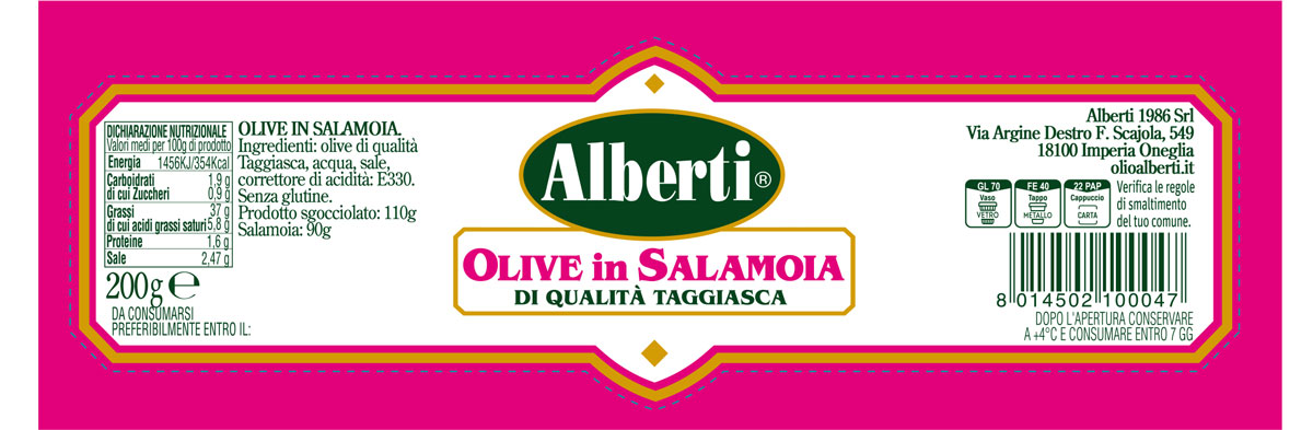 Dopo la raccolta, le olive di qualità Taggiasca sono conservate circa un anno in una salamoia composta da acqua, sale, erbe aromatiche e aromi naturali ed invasate.