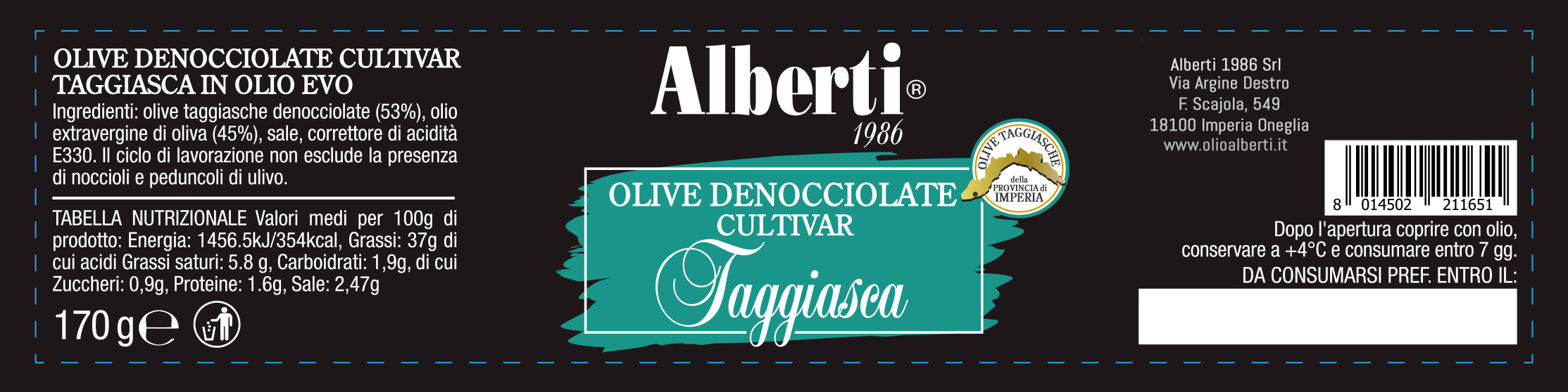 Dopo la raccolta, le olive di qualità Taggiasca sono conservate circa un anno in una salamoia composta da acqua, sale, erbe aromatiche e aromi naturali. Vengono poi denocciolate con un particolare processo di lavorazione e confezionate in Olio Extra Vergine di Oliva.