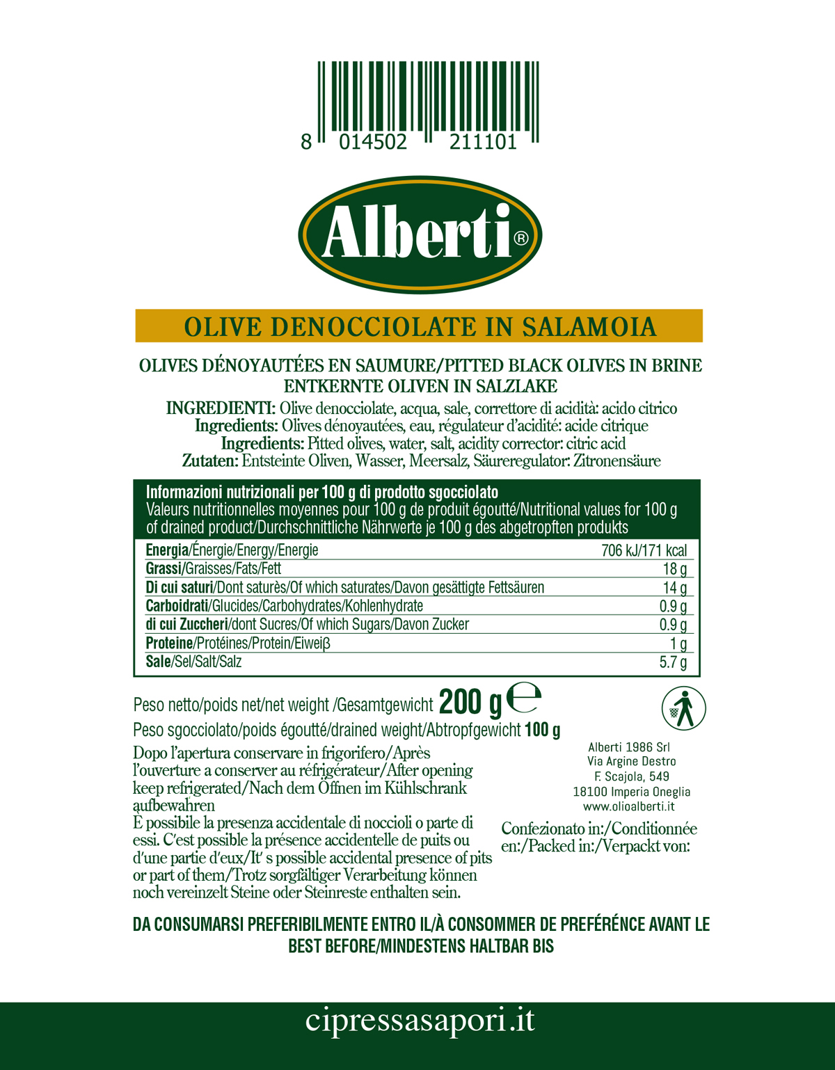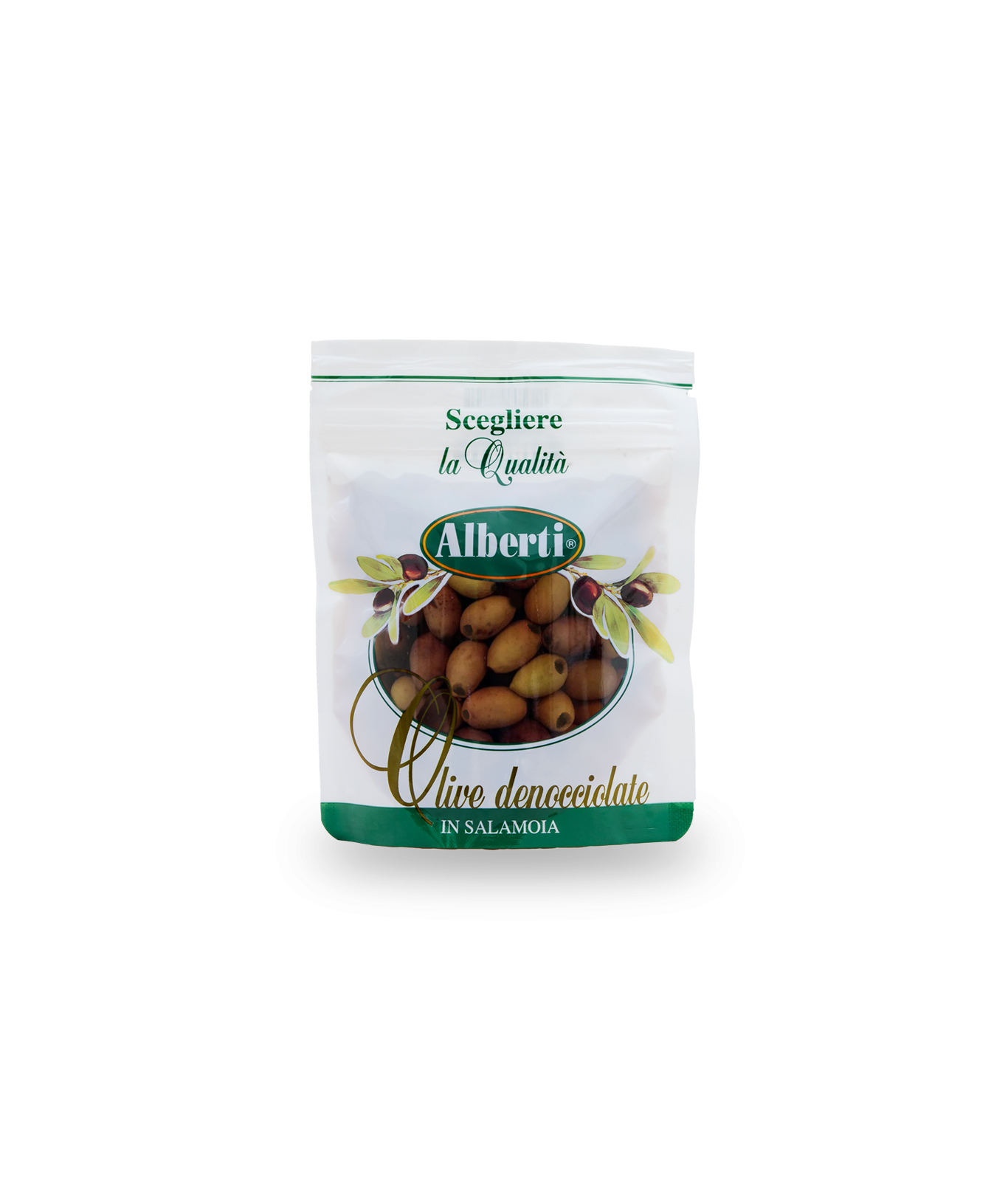 Selezionatissime olive di qualità provenienti dal territorio italiano, denocciolate e conservate in tradizionale salamoia.